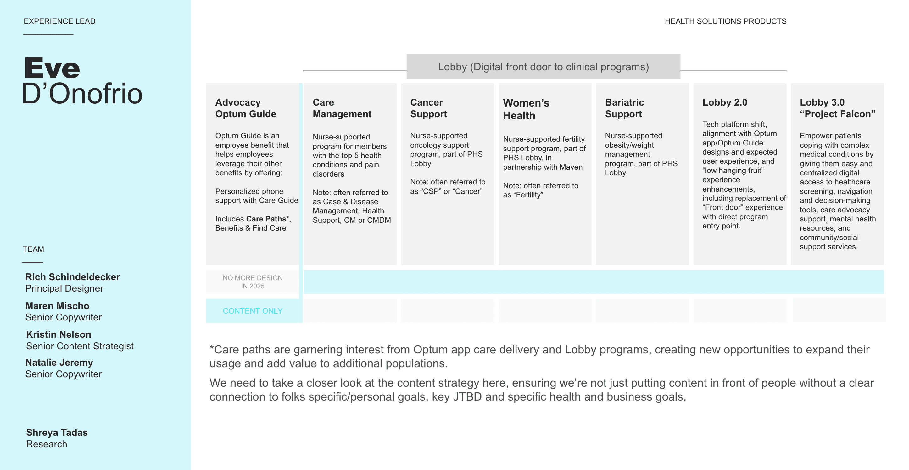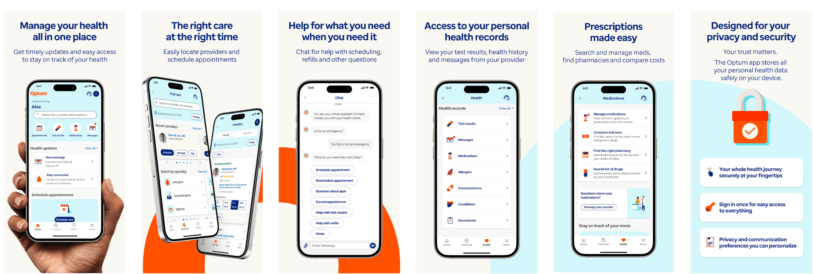 Led content strategy and UX design for digital healthcare experiences across Optum Health Solutions platforms, serving millions of members on mobile and web.