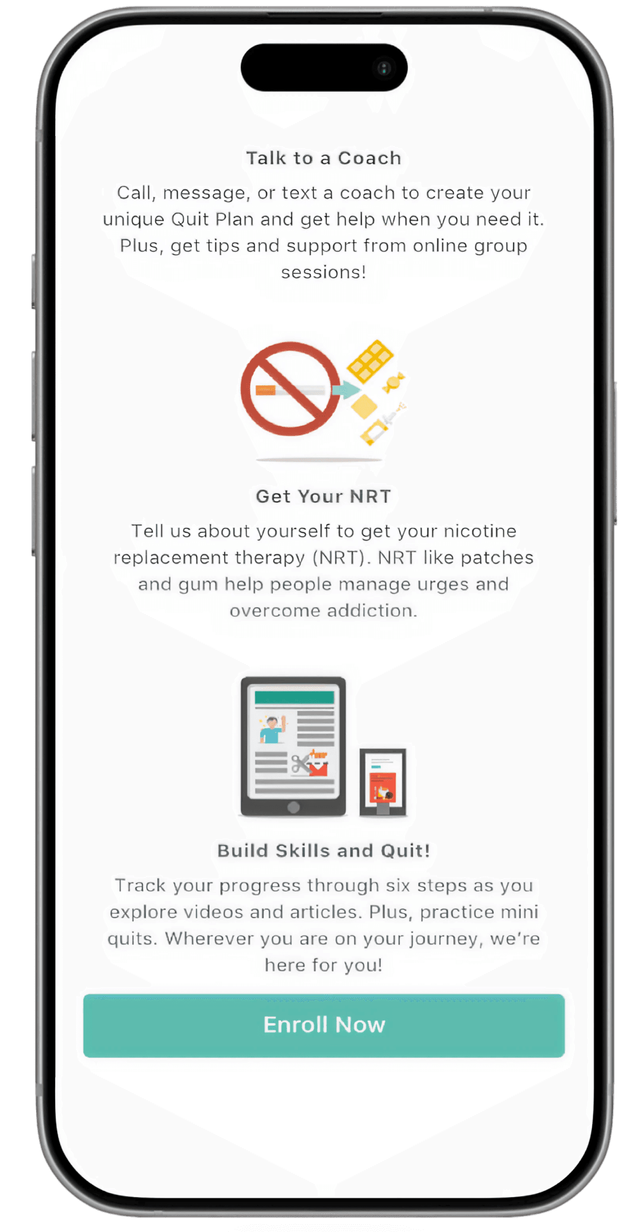 Designed comprehensive UX writing across enrollment flows, the quit continuum, milestone prompts, coach interactions, notifications, and post-enrollment touchpoints on web, iOS, Android, email, and marketing materials.